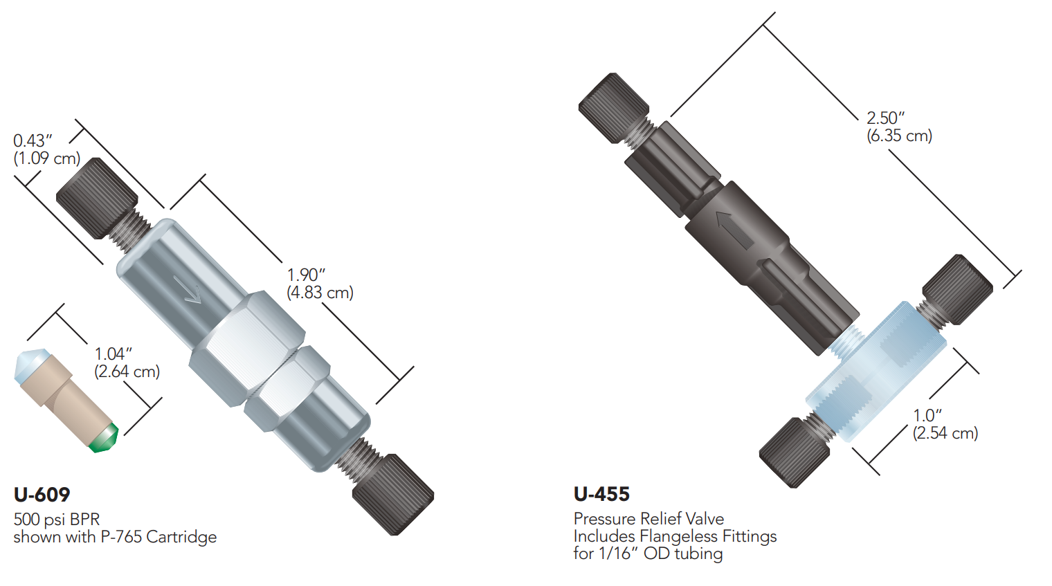Biotech Fluidics provides a range of convenient Back Pressure Regulator (BPR) Assemblies that are designed to tackle exactly these situations. With a wide selection of BPR Cartridges tuned to different opening pressures, which fits into BPR Holders of different materials, this modular construction forms a wide range of BPR Assemblies for a variety of different flow system designs and requirements. Most BRP Cartridges (40 to 1000 psi) can easily be exchanged by the user, whereas the cartridges with lowest pressure settings (5 & 20 psi) are not replaceable.
