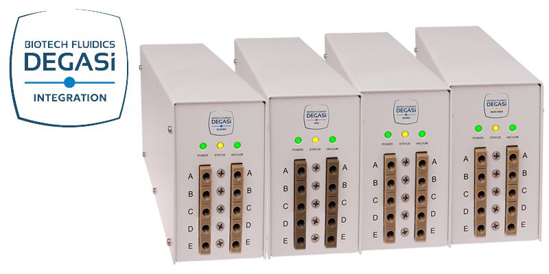 The DEGASi® family of stand-alone inline degassers are available in a couple of core designs with different capabilities and features. The core designs are then configured with degassing channels for different solvents and flow rate ranges. All degassers from Biotech Fluidics rely on long-lifetime vacuum pump technology with closed-loop vacuum control plus advanced leak and error detection functions, to provide ultra-stable performance in every degassing situation.