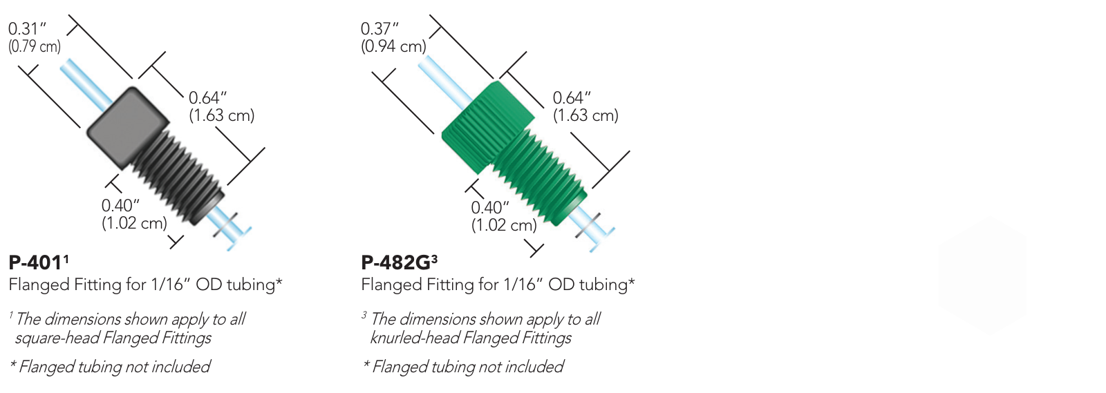 | P-401 | Flanged Fitting for 1/16” OD Tubing | 1/4-28 Flat-Bottom | 5/16” Square | Delrin Black/SST | P-407 |