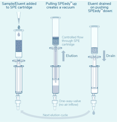 The ingenious design of the SPEedy™ piston ensures that its upward movement creates just the amount of vacuum required to transfer liquid through the SPE bed while the one-way check valve prevents any air leakage or back flow. Similarly, the downward movement of the SPEedy™ piston creates a sufficient positive pressure to displace the exit liquid trough the one-way check valve into a collection vial or to waste. After this, the SPE cartridge is ready for another wash cycle or sample elution.