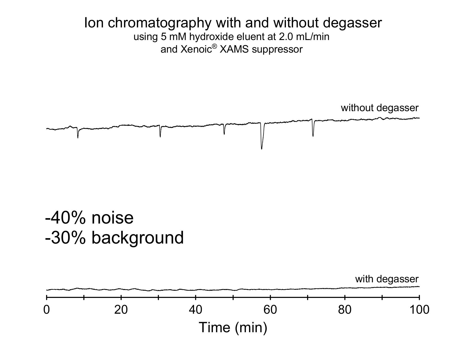 Installation of inline degassers reduce background and noise in suppressed ion chromatography.