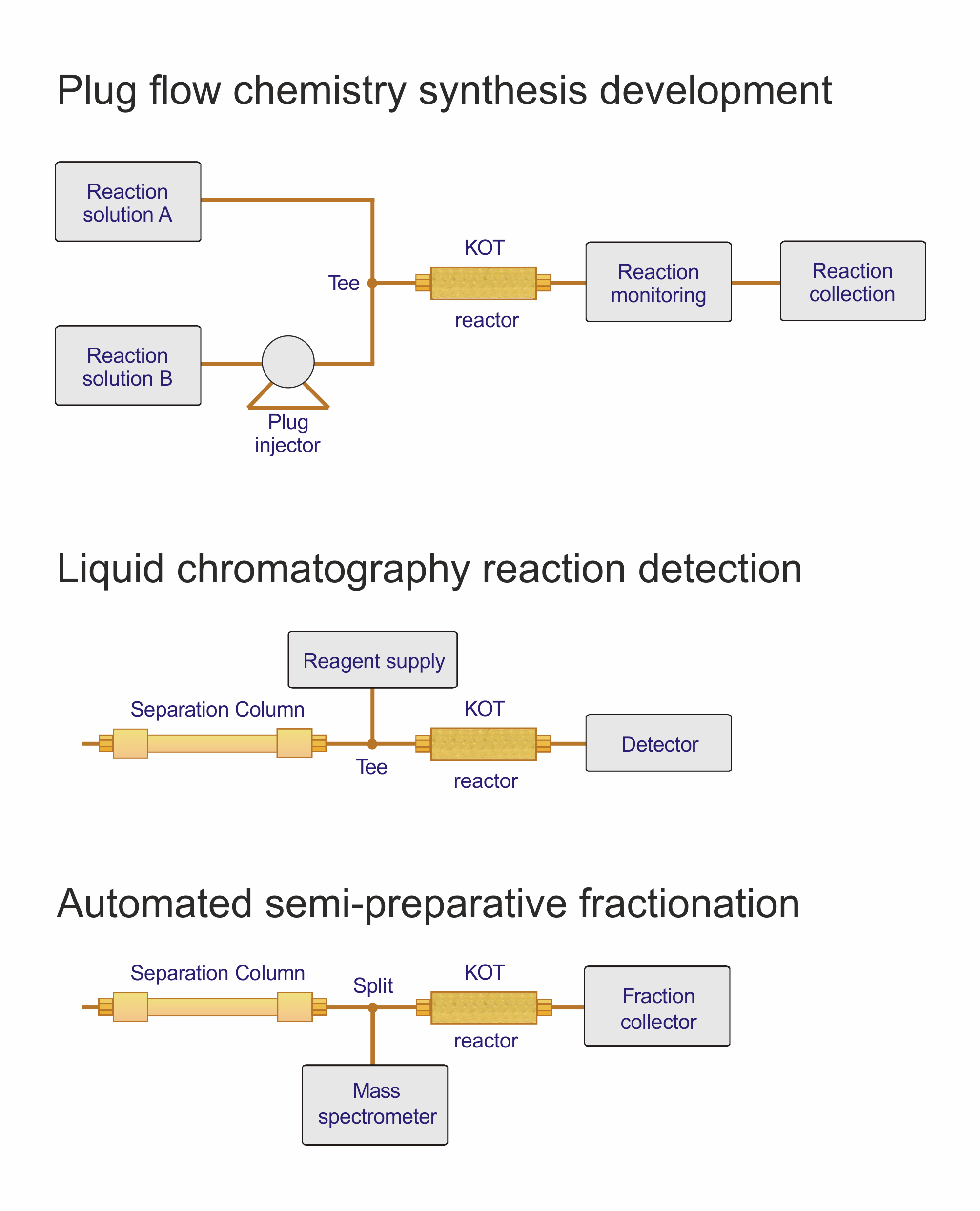 The reaction delay coils (also KOT tubular coil reactors) from Biotech Fluidics are the ideal delay elements to preserve plug flow while allowing time for reactions or other events in a stream of flowing liquid. Whether employed in the context of flow chemistry synthesis, or in more traditional liquid chromatography setups, the reaction delay coils provide an unmatched capability of preventing zones from mixing with the surrounding upstream and downstream liquid in a flowing stream. This feature can be used to maintain high concentrations of reagents during plug flow chemistry reaction development, with minimum dilution by the transport liquid. Originally, these reaction delay coils reactors were designed to preserve the integrity of chromatographic peaks during post-column reaction detection in HPLC. They were later applied to allow time for data collection and automatic decision making during online monitoring of semi-preparative liquid chromatography fractionation. Both these are still important application areas. The picture below shows some typical set-ups incorporating reaction delay coils in these different systems handling plug flow in fluid streams.