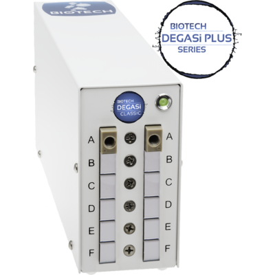 The DEGASi® Plus Classic degasser is the first choice for most applications in analytical instrumentation and liquid chromatography, including typical reversed phase HPLC and ion chromatography applications with flow rates up to 3 mL/min. The port design is 1/4-28 Flat-Bottom for connection of tubing with OD ranging from 1/16” to 1/8”. This degasser is equipped with 1-6 chambers with biocompatible flow path of 480 μL for aqueous-organic liquids, but is not compatible with hexane and similar organic solvents.