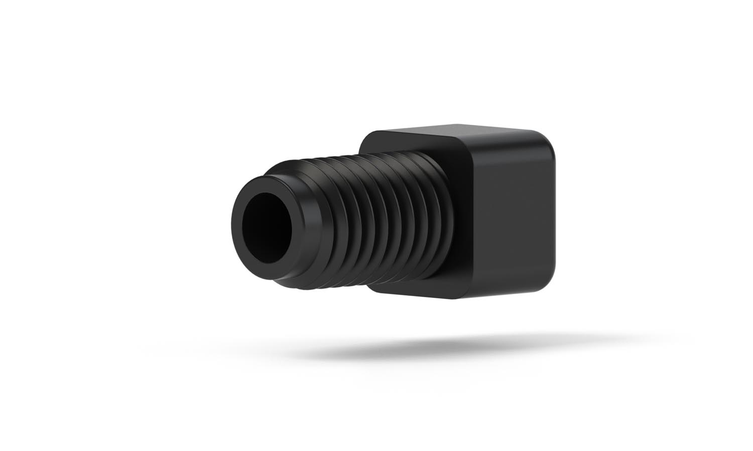 Our Flanged Fitting is made from versatile Delrin. Our versatile Delrin nut resists cross threading or loosening during use delivering excellent dimensional stability It includes a 316 stainless steel washer. This fitting is compatible with a 1/4-28 Flat-Bottom port geometry. Our Delrin fitting has a 5/16″ Square Head style and is for is for 1/8″OD Tubing. It comes is black. Brochure