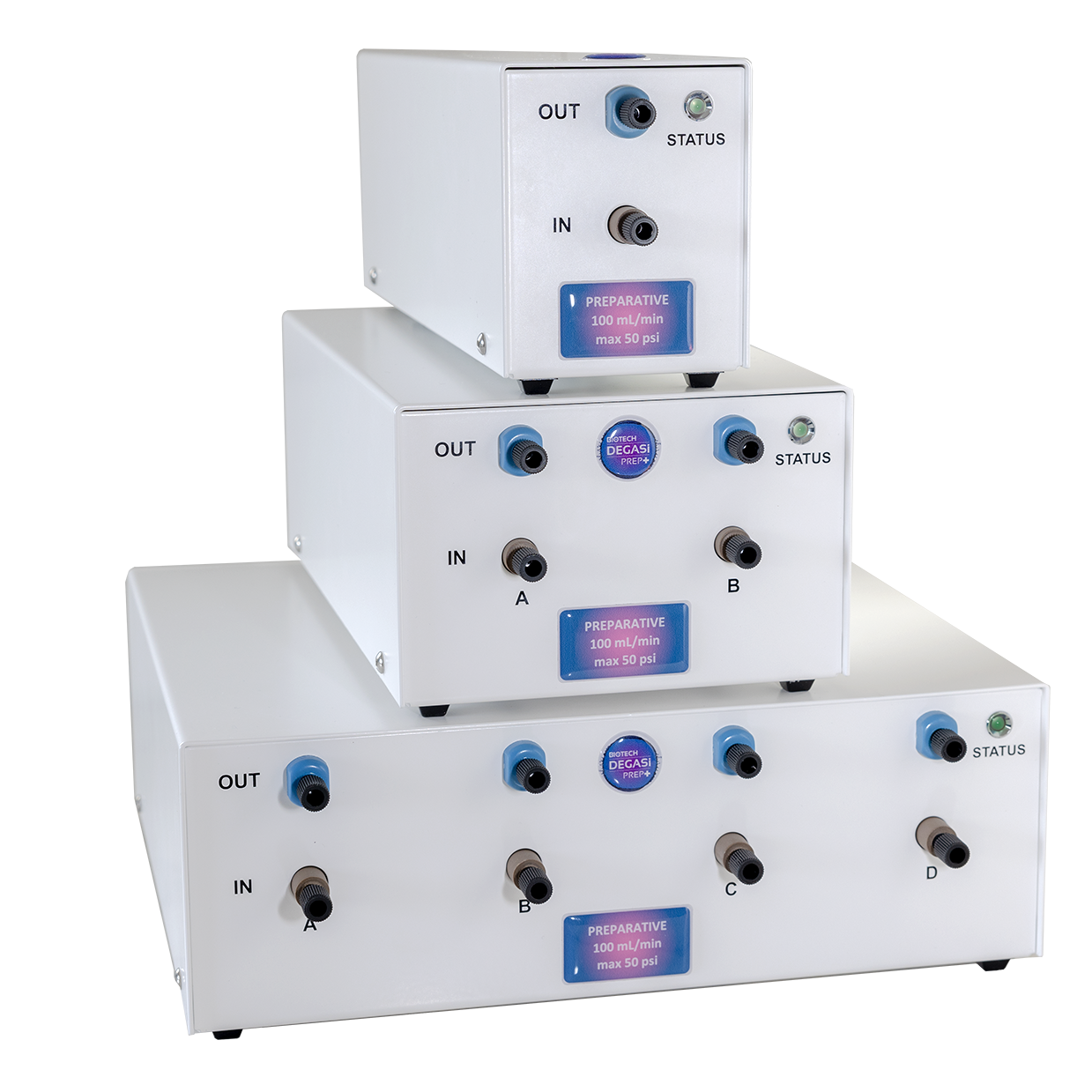 An additional model in this family of degassers is the customizable DEGASi® Prep+ AUX degasser which is configured with an additional auxiliary analytical channel of your selection. The DEGASi® Prep+ AUX model is available with 1, 2, or 4 preparative channels which can handle flow rates up to 75-100 mL/min/channel.